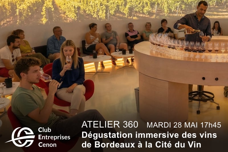 Le Club des Entreprises de Cenon vous invite à vivre l'Atelier 360 à la Cité du Vin : une dégustation de 4 vins de Bordeaux guidée par un sommelier, dans un espace immersif à 360° qui vous transporte à travers les paysages emblématiques de la région.